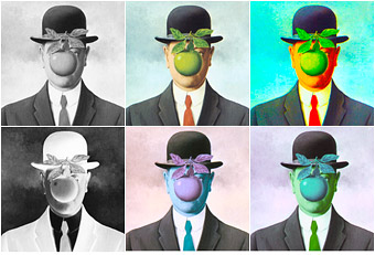 看完了單純 RGBA 的圖片說明,對於色彩矩陣應該有了初步的認識,接下來就來點比較複雜的,直接用一張具有各種色彩的圖片來玩玩看!以下我選擇了我最喜歡的超現實主義大師 Rene Magritte 的代表作 The Son of Man 的截圖來向大師致敬!