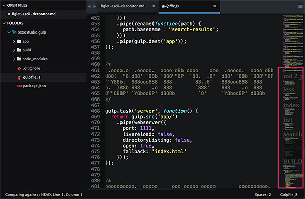 接著談到為什麼在 SublimeText 裡頭會用到文字與線條組成的圖形,主要因為 SublimeText 的右側有一個區塊負責顯示程式碼的縮圖,當今天程式碼非常多行的時候,就可以利用這種特殊的「大型字體」來分隔,同時在右側因為縮圖的關係就會變成是較為清晰的「小字」,往後要查找個別區塊就可以直接利用縮圖查找,非常的方便和迅速。