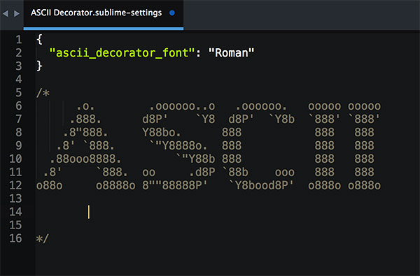 後來學聰明直接用套件來完成,因為在 SublimeText 裡頭有趣的套件,就叫做:ASCII-Decorator,有興趣的人可以直接安裝,或從 Github 上頭下載 ( https://github.com/viisual/ASCII-Decorator ) ,安裝之後,只要選取需要變成 ASCII Decorator 字體的文字,按下cammand (ctrl) + shift + k就可以進行轉換,而我們也可以再套件的 user 設定裡,設定轉換的字體,個人推薦「Roman」字體,相當的清晰。