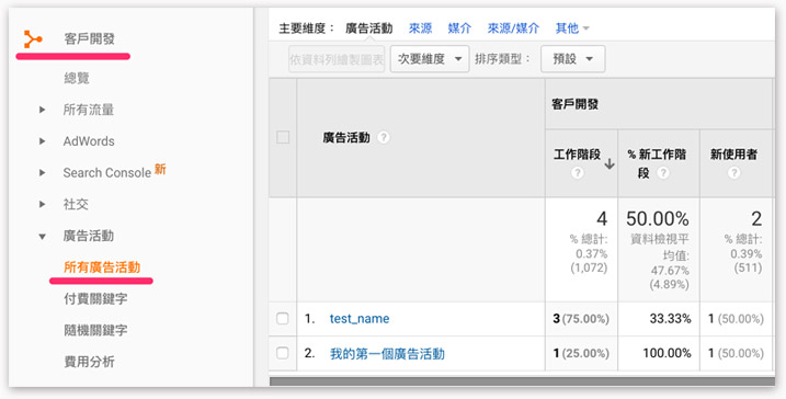 產生網址之後,只要使用者點擊了這段網址,在 GA 內就可以看到分析數據,舉例來說只要有使用者透過追蹤連結到我的測試頁面,就會在 GA 裡面看到相關資訊 ( 客戶開發 > 廣告活動 )。