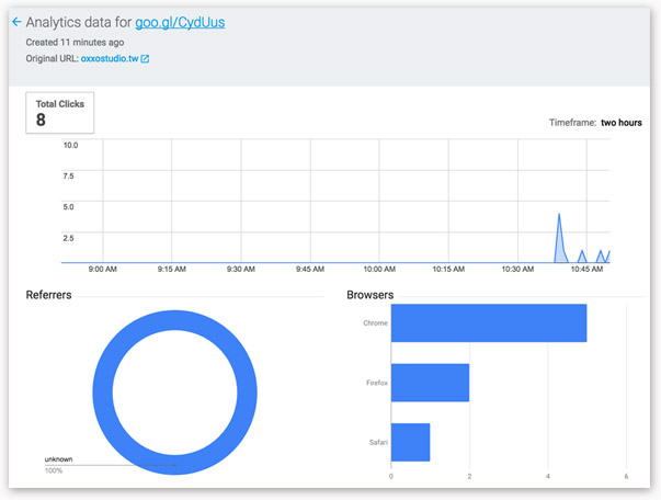 舉例來說 https://goo.gl/CydUus 這是一個連到我的部落格的短網址,複製這串短網址 ( 不要點選 ),在瀏覽器的網址列貼上,並在後方輸入一個「+」號,按下 enter 連結,就可以看到短網址偵測到的資訊,雖然說沒有辦法像 GA 一般的詳盡,但對於一些無法加入 GA 追蹤碼的頁面來說,也不失為一個觀察的好方法。