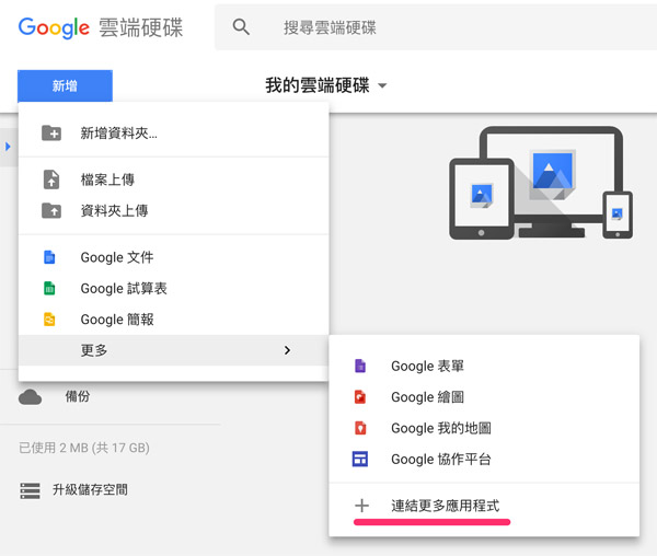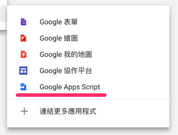 回到雲端硬碟,這時候再度點選左上方的新增按鈕,就可以看到 Google Apps Script 了。