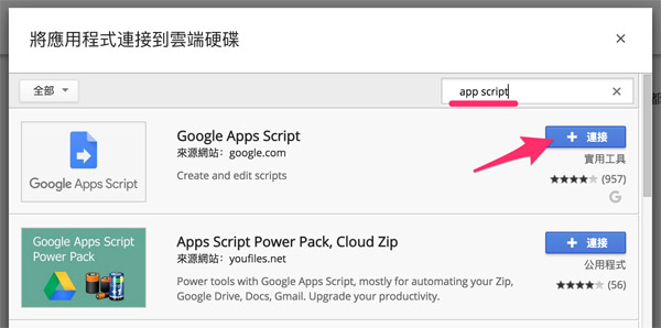 搜尋 app script,就會看到 Google Apps Script,點選後方「連接」,就可以加入雲端硬碟。