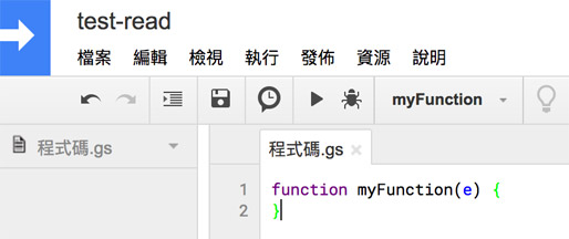 點選 Google Apps Script 後會開啟一個新專案的編輯畫面,我先把這個專案的名稱改為:test-read。