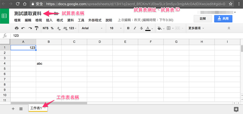 再來就是要建立準備拿來讀取的試算表了,回到雲端硬碟,透過新增按鈕新增一份 Google 試算表,隨便輸入一個檔名,這個檔案名稱是試算表的名稱,不是工作表的名稱,每個試算表可以包含很多個工作表,工作表在下方用一個個的 tab 來區分,而試算表的 id 與工作表的 gid 在網址就可以看到。
