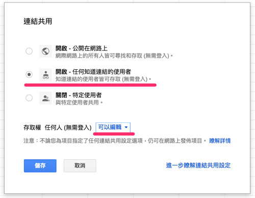 由於可能會測試寫入或讀取資料,所以得先把試算表的權限打開為「任何知道連結的使用者,都可以編輯」,到這邊差不多就完成試算表的基本設定,可以準備來用 Google Apps Script 操控試算表了。