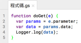 接著點選「程式碼.gs」開始編輯,裡頭預設有一個名為 myFunction 的流程,將其改為 doGet,一定要是這個名稱,因為這是 Google Apps Script 規定的。doGet 包含一個 e 的參數作為傳值使用,屆時我們只要把要儲存的資料提交給 e,就可以儲存,然後我們在 goGet(e) 裡設一個區域變數 data 來接收 e.parameter 所解析出來的值,最後由Logger.log()顯示出來。