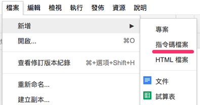 為了測試這個 doGet 是管用的,建立一個 debug.gs 來測試,點選上方「檔案 > 新增 > 指令碼檔案」就可以新增,新增後把這個檔案命名為 debug。
