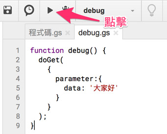 將 debug.gs 裡面的 function 換成下面的程式碼,存檔之後,點選上方的執行按鈕。