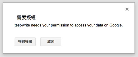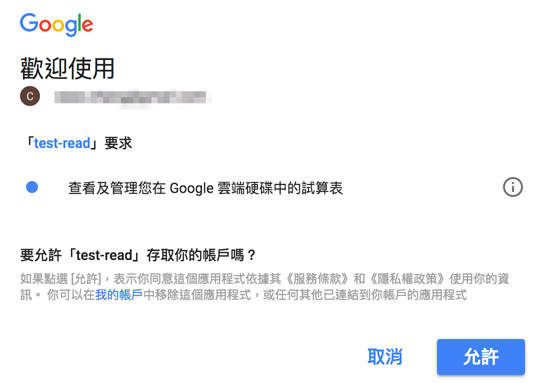 核對權限的目的主要在於我們要操控 Google 試算表,因為這個 Script 同時可以建立、編輯或刪除試算表,所以需要我們允許才可以執行。( 點選「允許」 )