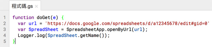 回到 Google Apps Script,把剛剛寫的「程式碼.gs」內容換成下面這段程式碼,從裡面可以看到一個叫做 SpreadsheetApp 的變數,要讀取或寫入 Google 試算表,都會透過這個 SpreadsheetApp 所包含的屬性或方法來實現,它預設包含兩種打開 Google 試算表的基本作法,第一種是 openById(id),表示透過文件的 id 來打開,第二種是 openByUrl(url),表示透過網址來開啟。