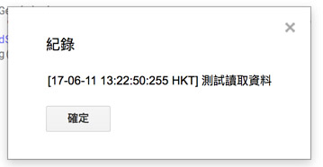點選後從檔案的紀錄裡 ( 檢視 > 紀錄 ),就可以看到試算表的文件名稱「測試寫入資料」,表示已經可以透過 Google Apps Script 讀取試算表資訊了,如果把檢視紀錄那段換成Logger.log(SpreadSheet.getActiveSheet().getName());,就可以秀出目前這個網址的試算表名稱。( 由網址後方接的gid=0判斷 )