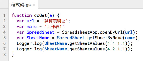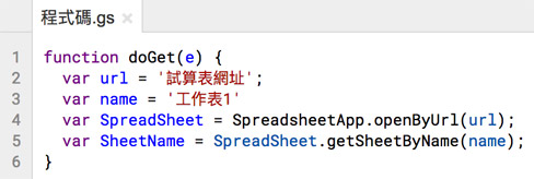 打開 Google Apps Script,把「程式碼.gs」改成下面這段程式碼,透過程式碼將試算表與試算表名稱提交給 Spreadsheet 和 SheetName 這兩個變數。