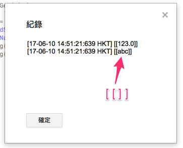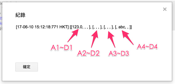 換個角度思考,如果取出「一個範圍的數值」,應該就會用陣列的形式表現出來,以下面的程式碼來說,執行之後,就可以在記錄裡 A1 到 B4 中間所有儲存格的資訊,在陣列裡,亦可很清楚的看到 A1 的數值為 123,B4 的數值為 abc。