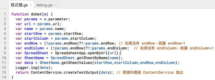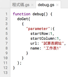 先看到 debug.gs,把要抓取的儲存格 row 與 column 號碼變成 parameter 的屬性,網址和工作表名稱也變成變數,執行後把 parameter 傳給 doGet 即可。
