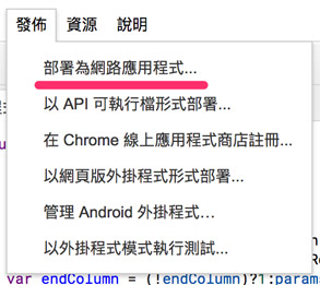 要在外部的網頁透過 Google App Script 讀取資料,就得先把程式部署到網路上,第一個步驟是點選上方的「發佈 > 部署為網路應用程式」。