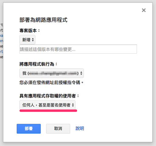 開啟部署畫面後,將具有應用程式存取權的使用者,設定為「任何人,甚至是匿名使用者」。