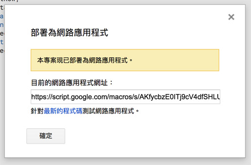 點選「部署」後,就完成部署的手續,這段應用程式的網址,就可以用來進行用網頁讀取試算表資料了。