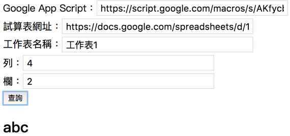沒有意外的話,執行網頁,填入對應的網址、欄位數字之後,按下查詢按鈕,就可以看到資料顯示在網頁裡了。