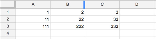 var SpreadSheet = SpreadsheetApp.openByUrl('試算表網址'); var range = SpreadSheet.getRange('工作表名稱!A1:C3'); range.setValues([[1,2,3],[11,22,33],[111,222,333]]);![]()