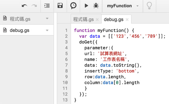完成主程式之後,就來寫個 debug.gs 測試,內容寫上要傳遞給 doGet 的數值,row 和 column 是由資料 data 自動計算出來的。