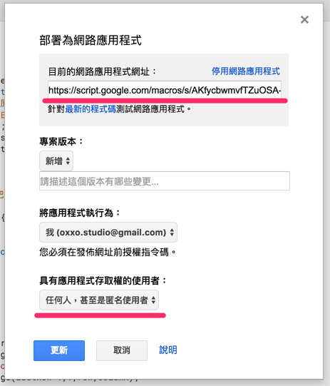 如果剛剛上面都沒問題,先把寫好的程式碼部署到網路上,將存取權設定為「任何人,甚至是匿名使用者」。