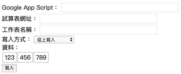 部署完成之後,就要來看看網頁端怎麼進行,網頁一開始在 HTML 先載入 jQuery,然後放入一些欄位,包含試算表網址、Google App Script 網址、工作表名稱、寫入方式...等,資料的話預設寫入一列三欄 ( 因為用 input 寫入陣列要做一些轉換,這邊就用最簡單的方法展示 )。