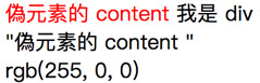 最後呈現的結果,第一段就是原本的 div 加上紅色的偽元素文字,下方第一段是 content 的內容,緊接著是偽元素的顏色屬性。