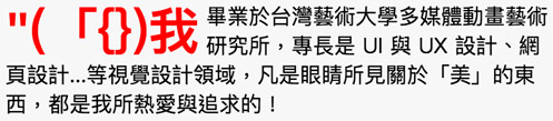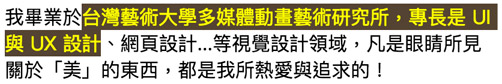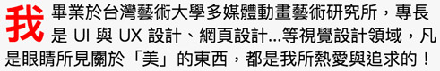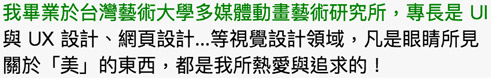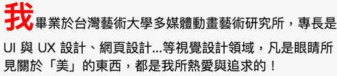 <p> 我畢業於台灣藝術大學多媒體動畫藝術研究所,專長是 UI 與 UX 設計、網頁設計...等視覺設計領域,凡是眼睛所見關於「美」的東西,都是我所熱愛與追求的!</p>