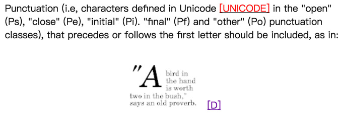 經過查詢 W3C 的資訊,發現了下面這段話,意思大概就是說網頁裡面有定義一些所謂「包覆式、點綴式的標點符號」,如果是這些包覆式的標點符號,基本上就無法放大,反而需要搭配其它字元使用,也因如此,在使用第一個字元變化的時候,就要注意有這種特殊狀況會發生。
