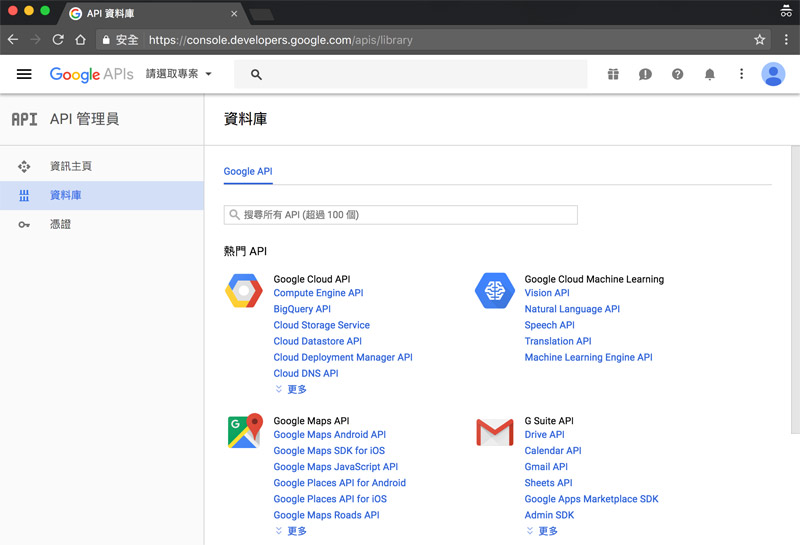 如果要更近一步的操作地圖,必須使用 Google Maps API 來實現,要使用對應的 API,則是要用 Google 帳號登入 Google API Console,裡面包含了各式各樣的服務,每種服務都有提供一個以上的 API。