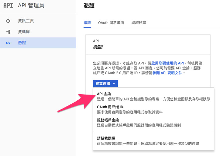 在使用 Google Map 服務的時候,都必須先申請憑證才能使用,點選「憑證」,接著點選「建立憑證」,選擇 API 金鑰,就可以開始建立專屬的金鑰 key。
