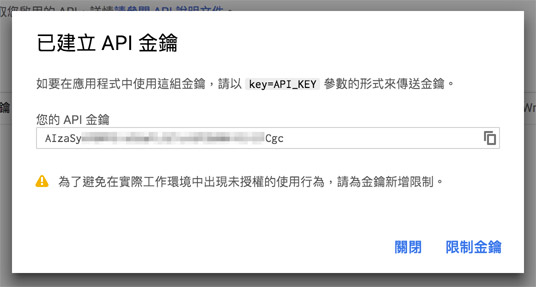 API 金鑰就是一段很長的代碼,這段代碼可以讓 Google 識別是哪個使用者在用對應的服務,並且根據使用者權限和使用的服務,提供對應的功能和限制。
