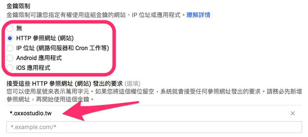 建立金鑰之後最重要的事情,就是限制金鑰,限制金鑰也就是保護金鑰,避免金鑰外流造成別人也能用 ( 假設這個金鑰一天只能用 100 次,外流之後別人用了 99 次,你就只能用 1 次 ),限制的方法有以下幾種:HTTP 參照網址、IP 位址、Android 應用程式與 iOS 應用程式,舉例來說如果我將我申請的金鑰限制設定為 HTTP 參照網址,並且輸入我的 domain name 作為規則,這組金鑰就只能在我的部落格使用,別的網站就無法使用。