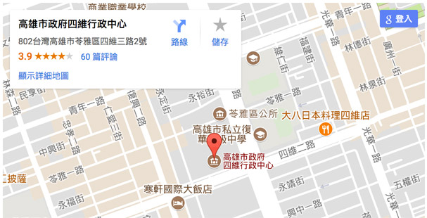 <iframe width="600" height="450" frameborder="0" style="border:0" src="https://www.google.com/maps/embed/v1/place?key=你的金鑰&q=高雄市政府" allowfullscreen> </iframe>![]()