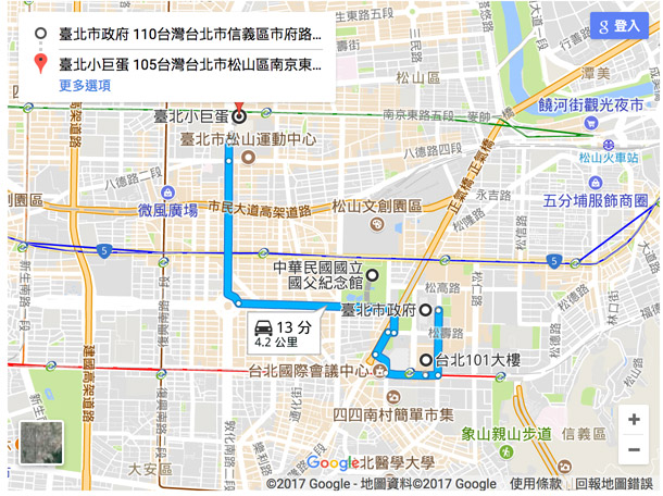 舉例來說,下方的程式將會在地圖上,標記出從台北市政府前往台北小巨蛋的路線,路線沿途會經過台北 101 與國父紀念館。