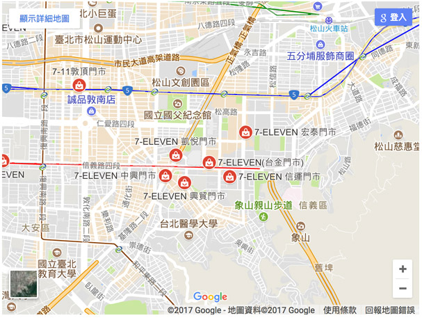 以下面的例子來說,將會標記出台北 101 周圍的 711 位置。