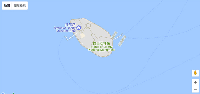 以下面的例子來說,打開地圖後,切換為衛星檢視,放大到一定程度可以看到一個 45 度角的自由女神衛星地圖,而中間正上方是地圖與衛星圖的切換,右邊中間為旋轉的按鈕,右下方是放大縮小按鈕,右上方為全螢幕按鈕,左上方是街景圖按鈕,左下方則是比例尺。