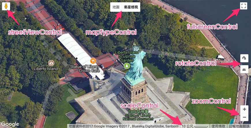 控制項屬性不是必要屬性,主要讓我們能在地圖的四周添加對應的控制元件 UI,例如放大縮小、旋轉、全螢幕、街景切換...等,控制項都是用 true 和 false 作切換,true 會顯示,false 則不會顯示控制項有下列這幾個: