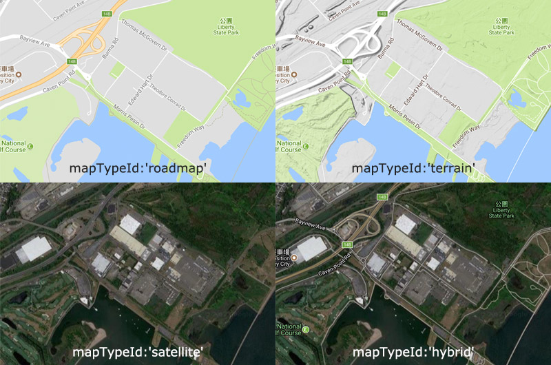 | mapTypeId | 地圖類型,共有四種:hybrid、roadmap、satellite 和 terrain,hybrid 是地圖與衛星空照圖合在一起,roadmap 則是純粹地圖,satellite 是純粹衛星空照圖,terrain 則是地圖與地形圖合在一起 ( 參考 範例圖片 )。 |