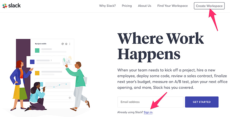 進入 Slack 的官網 ( https://slack.com/ ) 或下載它的軟體安裝,有別於一般的通訊軟體,Slack 的概念是要建立一個 WorkSpace 或加入已經存在的 WorkSpace,所以如果沒有 WorkSpace,是沒有辦法使用的,如果你已經有註冊,可以點選 sign in 來找自己的 WorkSpace。