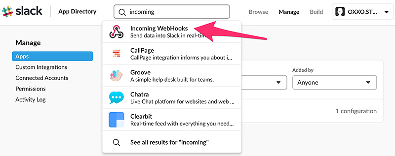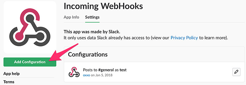 搜尋到 Incoming WebHooks 之後,點擊「Add configuration」將其增加到 WorkSpace 的配置當中。