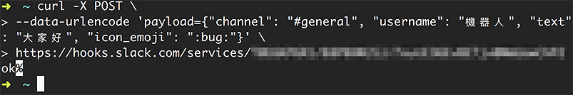 --data-urlencode 'payload={"channel": "#general", "username": "機器人", "text": "大家好", "icon_emoji": ":bug:"}' \