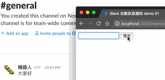 透過 JQuery 的 AJAX,就能夠很輕鬆地透過網頁,把訊息發送到 Slack 上,舉例來說,做個簡單的網頁,在裡頭放個輸入欄位和按鈕,搭配 JQuery 的寫法,就完成一個讓使用者可以發訊息給自己的簡單功能。