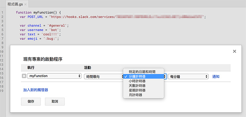 因為我自己沒有伺服器空間,所以就算會用 Node.js 發送訊息,但仍然沒有辦法讓這個機器人 24 小時不休息,所以就嘗試使用 Google App Script 的UrlFetchApp來完成,因為 App Script 可以指定「觸發時間」,舉例來說就可以指定在中午 12:00 發送個訊息提醒要吃飯,或是下午六點發訊息提醒要下班,都是可以很輕鬆的實現。